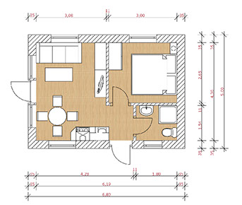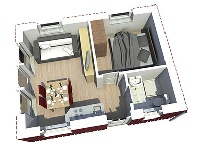 Wohn-/Eßbereich mit Küche, Schlafzimmer, Bad, 35 m²